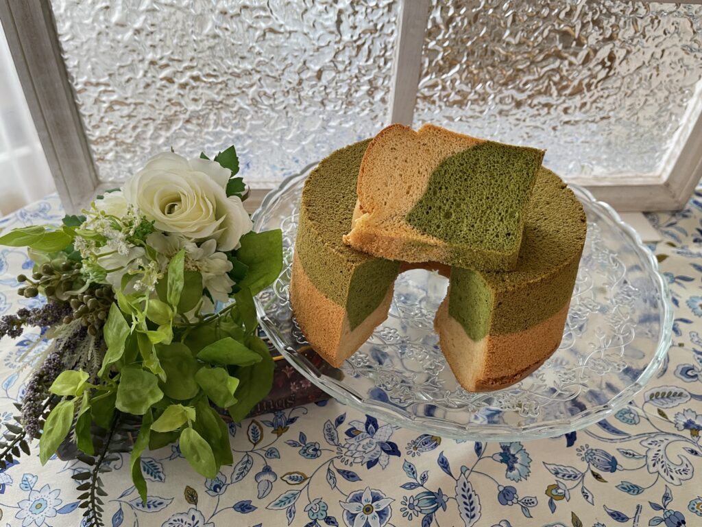 香り高い国産の抹茶と香ばしいきなこを重ねた二層仕立てで、ふたつの和の香りを楽しめる米粉のシフォンケーキです。